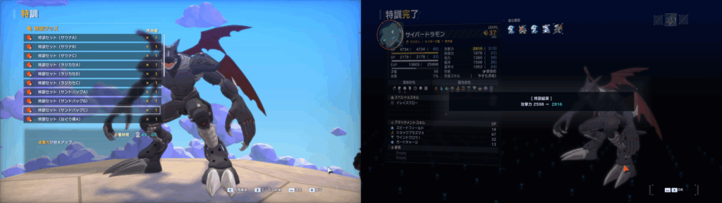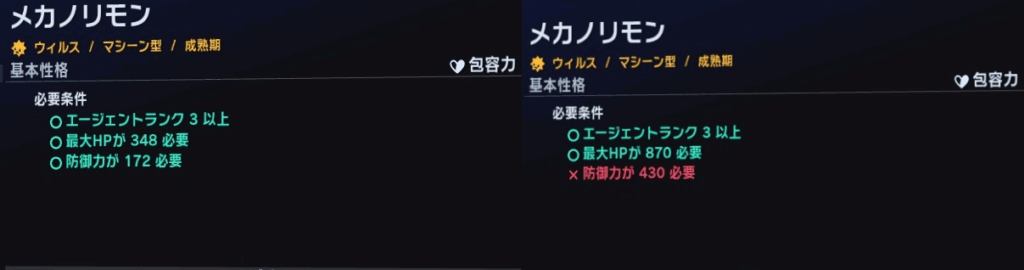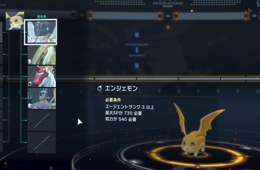 前作は①レベル②才能値③ステータスの3つが進化要件だったのですが、今作では①エージェントレベル(ストーリー進行度)②ステータスの2つだけが要求されるようになりました。つまりステータス条件さえ満たせばレベル1でも進化出来るという事であり、場合によっては入手したデジモンを一気に完全体まで目指せる事になります。①のエージェントレベルがかなりネックになりそうな所ですが、ゲーム中盤頃には完全体に進化出来るようになっている他、究極体に関しては終盤でないと進化出来ない代わりに、ロイヤルナイツなどへの進化に特定任務のクリアを要求されないので、この点は一長一短かなと思う所です。※前作同様デジモン毎に基本ステータスが決まっているので、ストーリー進行で縛られる分、進化・退化だけなら戦闘バランスが崩壊しにくくなっているのも利点と言える。