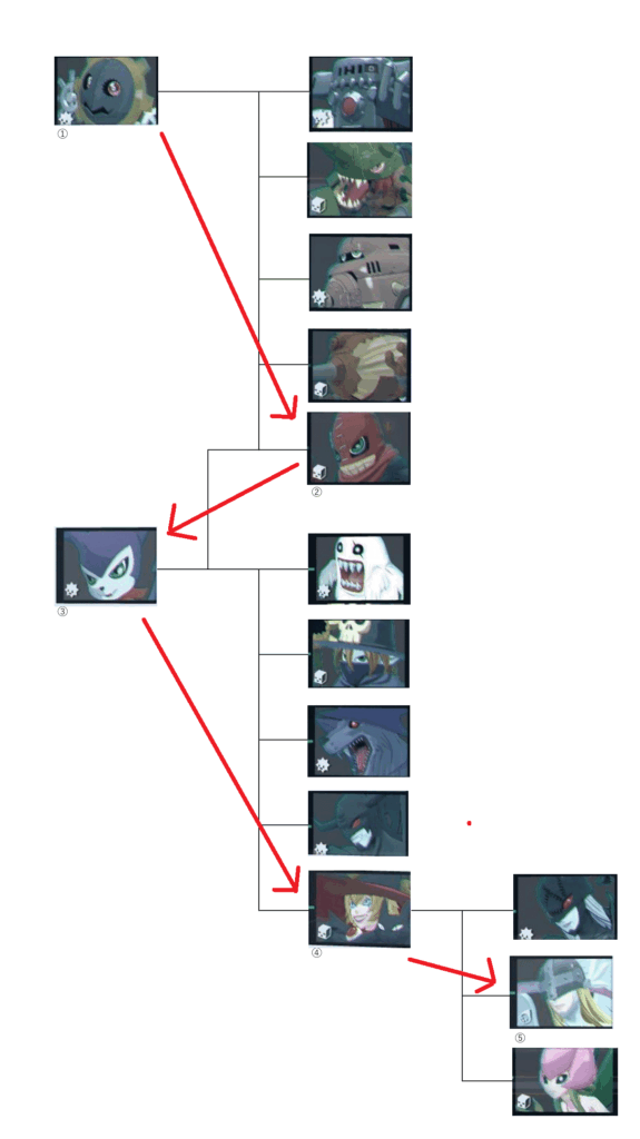 ↑進化と退化を繰り返す事で全く異なる系統のデジモンに派生していく事の例
