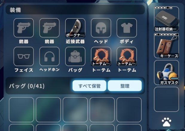 本作にも、本家の脱出シューターと同様に、倒されてもアイテムをロストしないインベントリ枠が存在します。主人公のアヒルは常に一匹の犬を引き連れているのですが、この犬に持たせたアイテムはやられてもロストしないという仕様があり、スキルツリーの成長枠に応じてこのインベントリ枠は拡張され、最大で4つまで犬に持たせる事が出来るようになります。