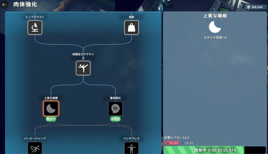 ↑探索で集めたアイテムを使ってスキルを解放する事ができ、永続的にステータスが強化される