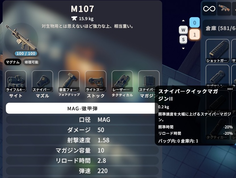 本作は中盤までは一般的な探索系ゲームと同様に、使い勝手の良い銃器が出てきたらそれに乗り換えていくといったプレイスタイルになっており、装備重量に余裕が出てきたら重いけど硬いアーマーを装備したり、戦闘における安定性を重視するか、探索での快適性を重視するか考えながら装備を整えたりするようなゲームになっています。