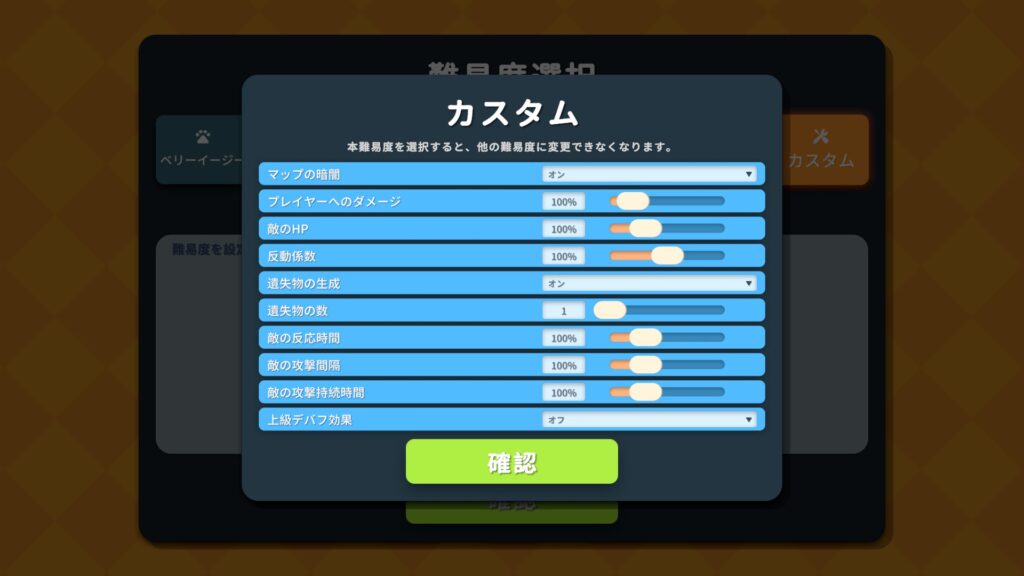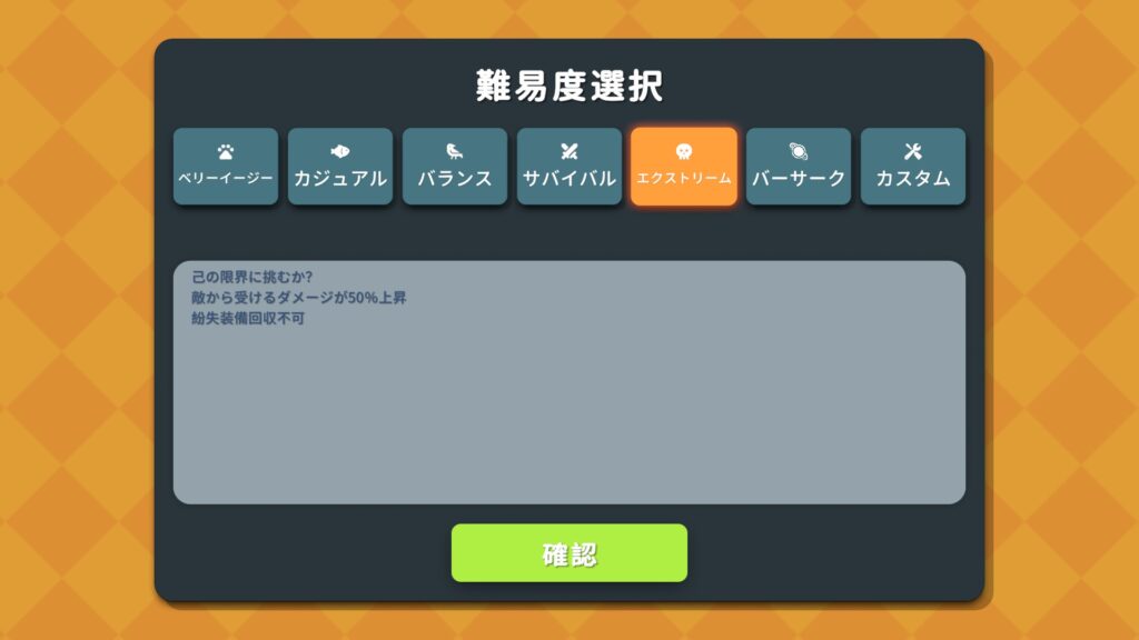 本作はソロゲーという事で、「ベリーイージー」「カジュアル」「バランス」「サバイバル」「エクストリーム」の5つが基本として、クリア後に追加される「バーサク」と、実績が解除出来なくなる代わりに細かく難易度設定を調節出来る「カスタム」の全部で7つの難易度が存在します。