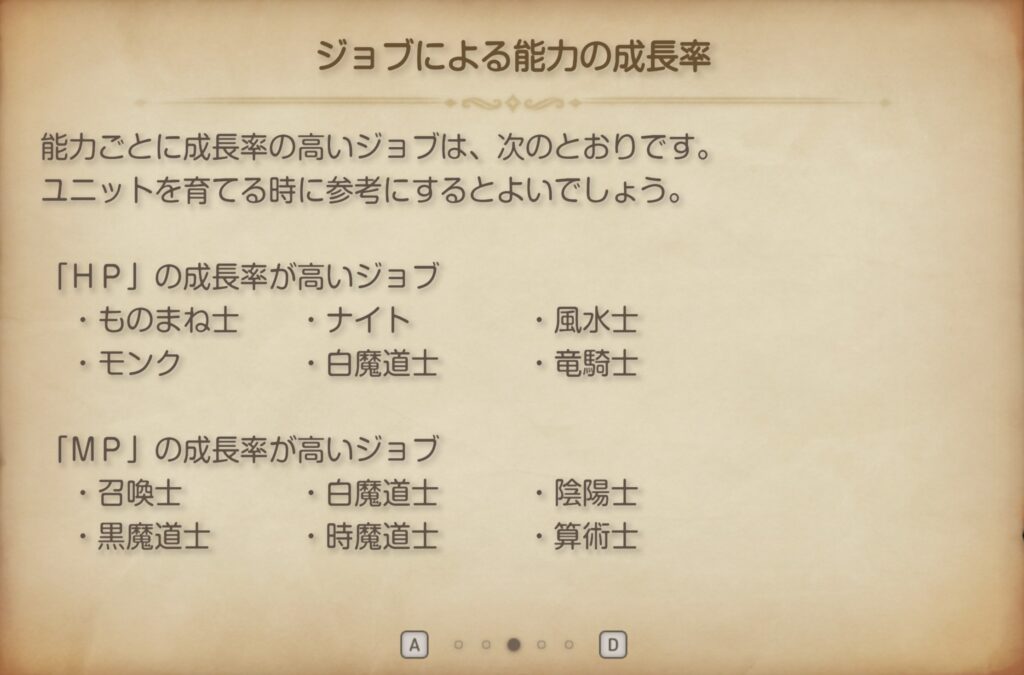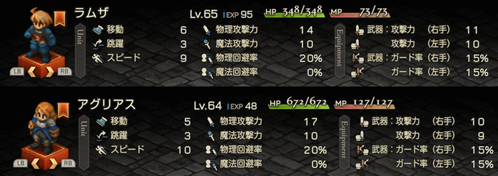 特に育成面は仕様を知っているかどうかで育成方針が全然変わったりするので、この辺は育成がプレイの中心になりやすいFFTでは重要ですし、もう少し詳しくゲーム内で書いてくれても良かったなと思ったりはします。