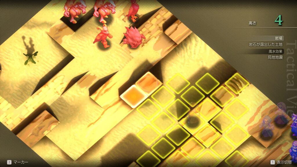 戦闘画面関連で言うと、上から見下ろすタクティカルビューといったものも追加されています。真上から見下ろしてくれるので、壁(崖)に囲まれた所にいる敵などそのままだとわかりにくい敵を選びやすい他、攻撃範囲の確認なども行い易くなっています。