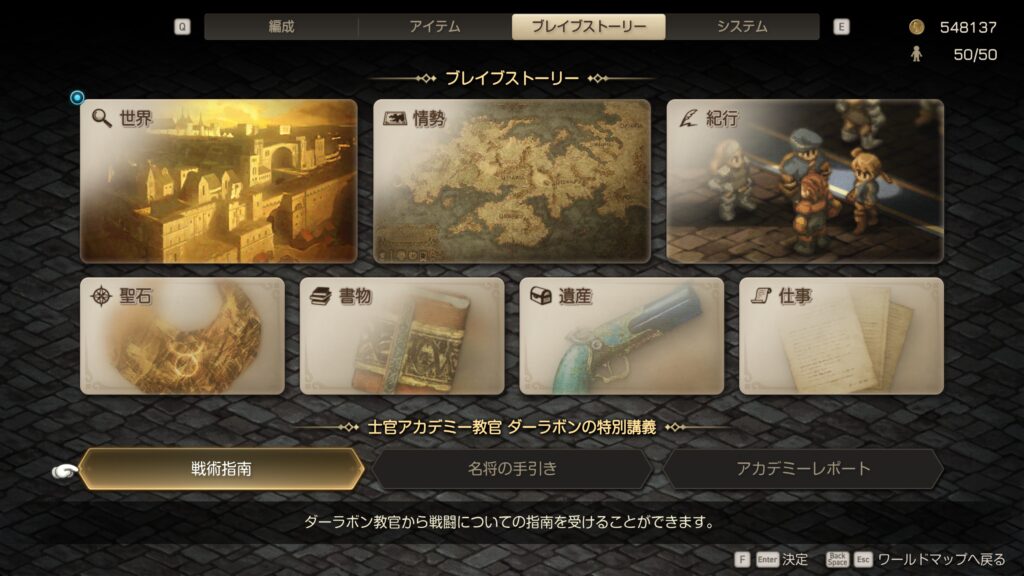 世界観説明を担うブレイブストーリーが一部拡張されました。個人的に嬉しいのは【情勢】という項目の追加で、今現在どのような状況なのかを簡単に振り返れる機能になっているので、あらすじとしてかなりわかりやすいものになっています。