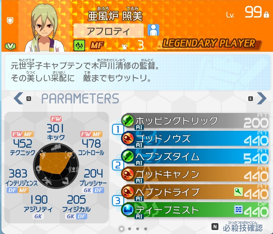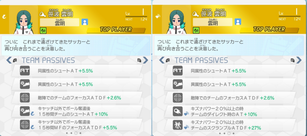 つまり例えば「ファウルを取られるまでチームのATDF+〇%」の監督パッシブの数を集めたい場合、補足2で触れたように、正義属性でドロップしやすい監督枠選手の中から、「ファウルを取られるまでチームのATDF+〇%」を持っている者を探せば良いという事です。「ファウルを取られるまでチームのATDF+〇%」の場合は、本作主人公である雲明が該当する形になっています。