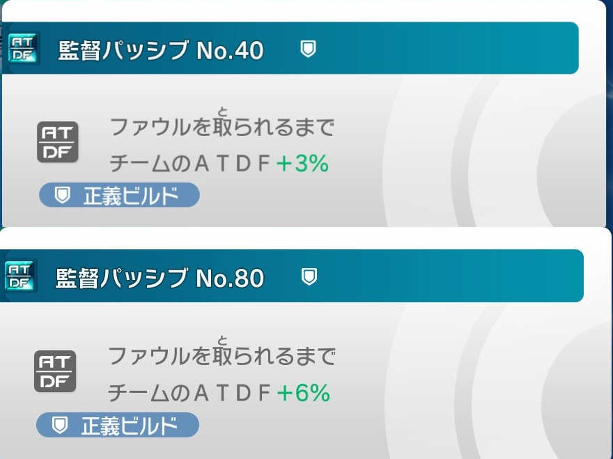 監督とマネージャーに関しては、パッシブスキルの付け替えが可能なので、厳選の必要性は殆どありません。またパッシブスキルを付け変えする上での制限も特にないため、例えば監督のパッシブスキルを5つとも「ファウルを取られるまでチームのATDF+〇%」にするといった形も可能です。